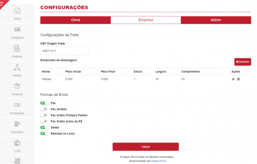 Menu Lateral - Configurações Empresa - Formas de envio Dimensões de embalagens (+Adicionar)