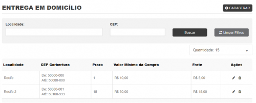 E para empresas que tenham seu próprio sistema de logística temos a funcionalidade Entrega a Domicílio. Onde a empresa poderá configurar os CEPs ao qual estejam em sua cobertura, assim como os preços de envio a partir desses CEPs cadastrados.