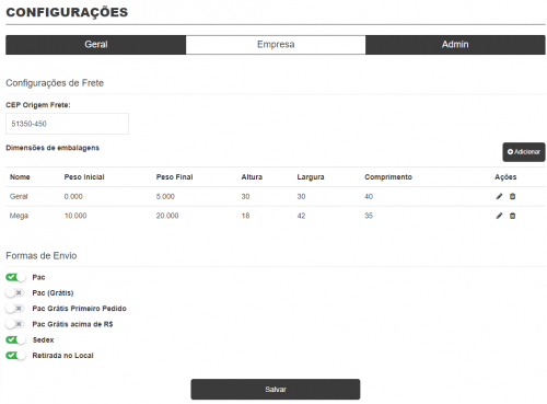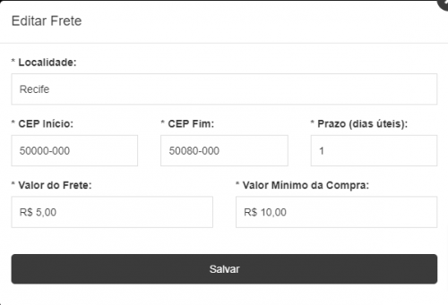 Por meio dessa funcionalidade a empresa poderá configurar os CEPs ao qual estejam em sua cobertura, assim como o prazo, valor minimo da compra e os preços de envio a partir desses CEPs cadastrados. Nessa funcionalidade você informará "CEP Inicio" e "CEP Fim" que você realizará entregas.